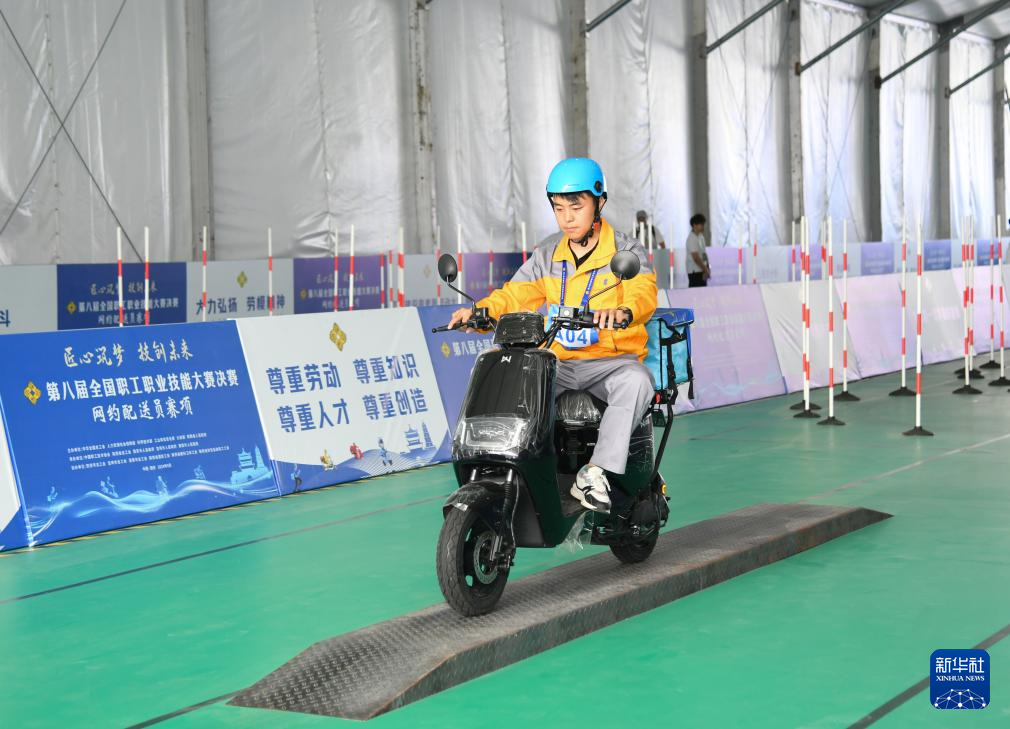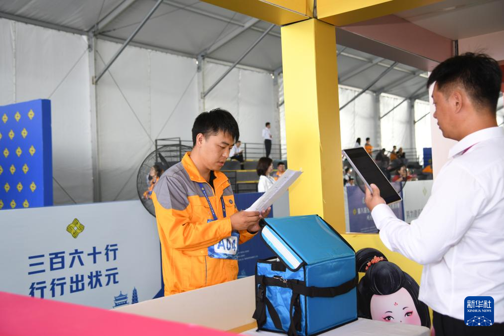 9月11日,选手在位于西安国际会展中心的比赛场地参加网约配送员工种比赛。