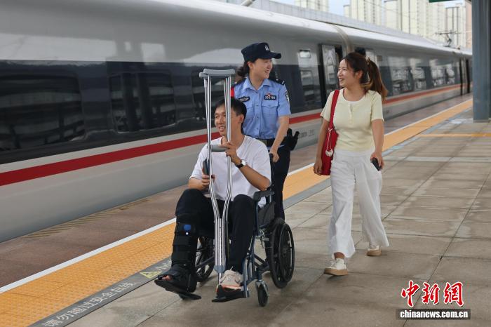2025年暑运启动以来,西安铁路公安局西安公安处宝鸡南站派出所迎来旅游、探亲、学生等多重客流叠加高峰。为全力保障旅客平安顺畅出行,派出所全警下沉一线,围绕治安管控、安检查危、便民服务等工作精准发力,为旅客营造了安全有序的出行环境。图为民警在站台帮助行动不便旅客乘车。张鑫摄