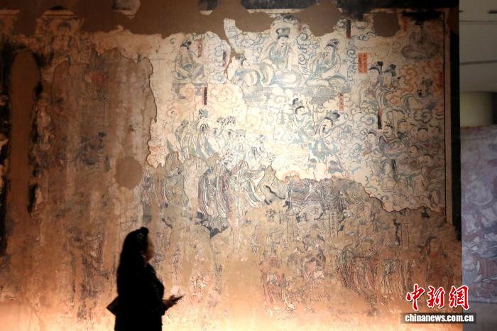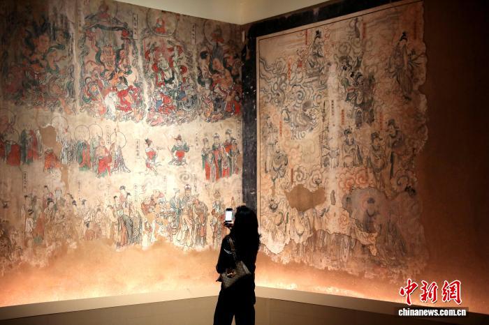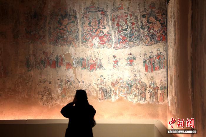 12月23日,陕西西安,市民参观展览。近日,《寿峰寺壁画》微展览在陕西省美术博物馆开幕,这也是这批2021年才完成修复的古代壁画珍宝,首次通过数字化的形式对公众展出。寿峰寺坐落于宜川县寺里村,始建于金大定三年(公元1163年),并于明清两朝进行大规模维修,三面墙体之上保存有大量古代壁画,并出现了清代壁画叠压明代壁画的双层壁画现场。因其完整呈现了明清两朝的制作工艺与艺术风格,兼具重要的历史、科学与艺术价值,故而成为研究陕西古代绘画艺术难得的珍宝。中新社记者张远 摄