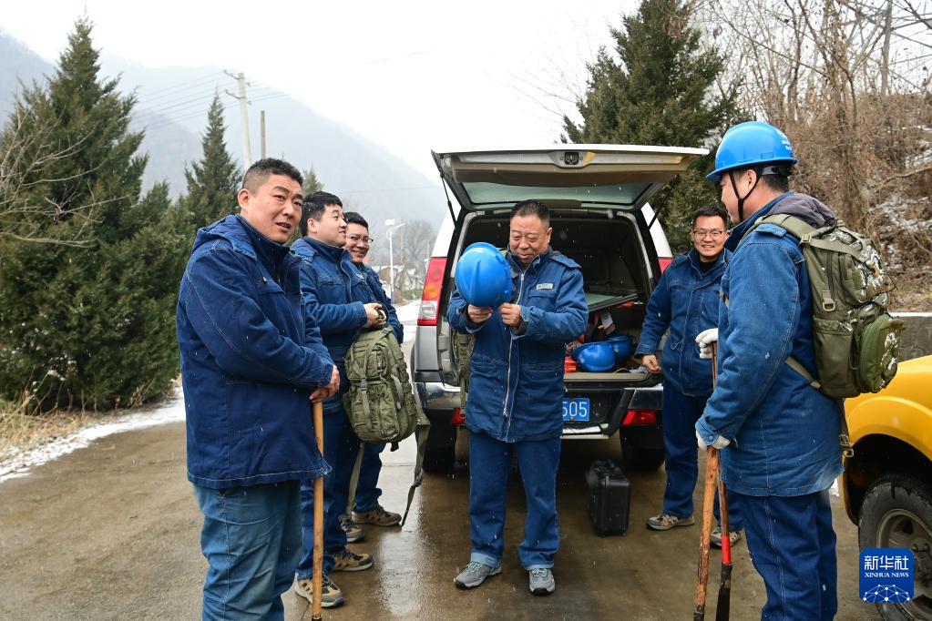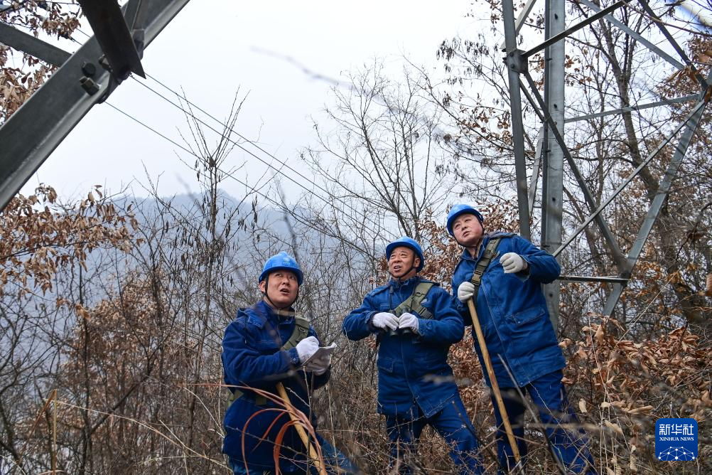 1月29日,国网宝鸡供电公司输电运检中心秦岭输电运维班班长周红亮(右)、副班长令云(中)、副班长薛龙在宝鸡市凤县黄牛铺镇东河桥村附近进行线路覆冰巡检。