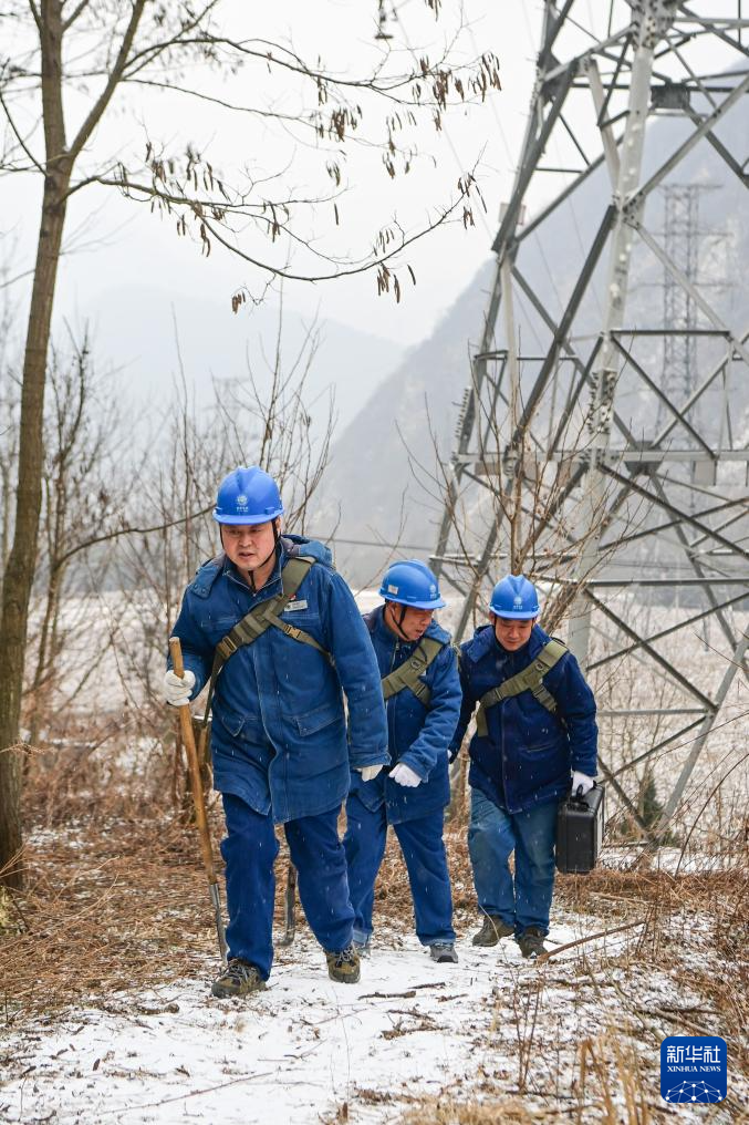 1月29日,国网宝鸡供电公司输电运检中心秦岭输电运维班班长周红亮(前)、副班长令云(中)、副班长薛龙在宝鸡市凤县黄牛铺镇东河桥村附近进行线路覆冰巡检。