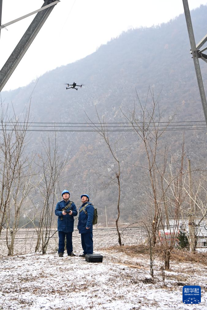 1月29日,国网宝鸡供电公司输电运检中心秦岭输电运维班班长周红亮(左)、副班长令云在宝鸡市凤县黄牛铺镇东河桥村附近使用无人机检查线路覆冰情况。