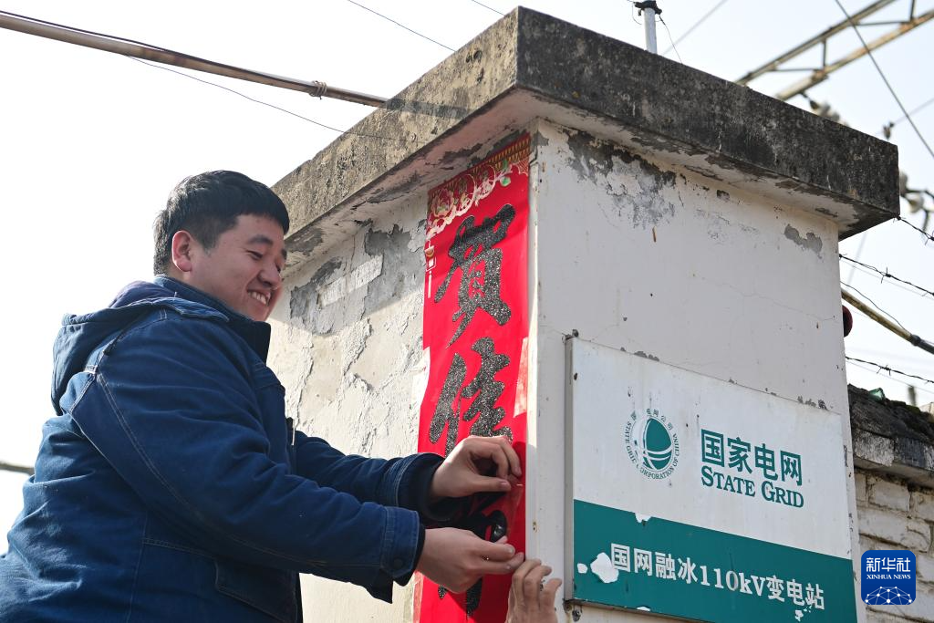 1月28日,国网宝鸡供电公司输电运检中心秦岭输电运维班成员赵鹤在变电站张贴新春对联。