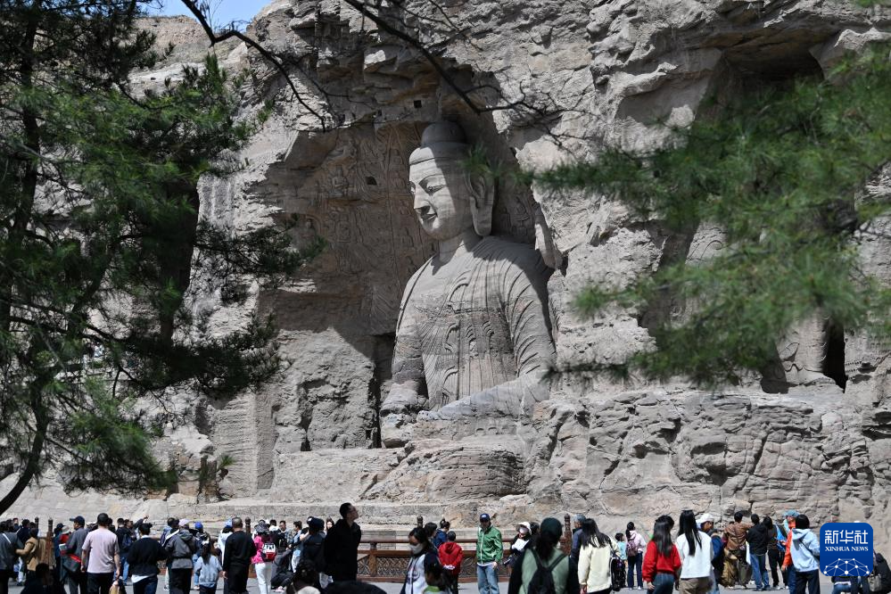 4月16日,在云冈石窟,游客摆出和大佛隔空“击掌”的姿势留影。