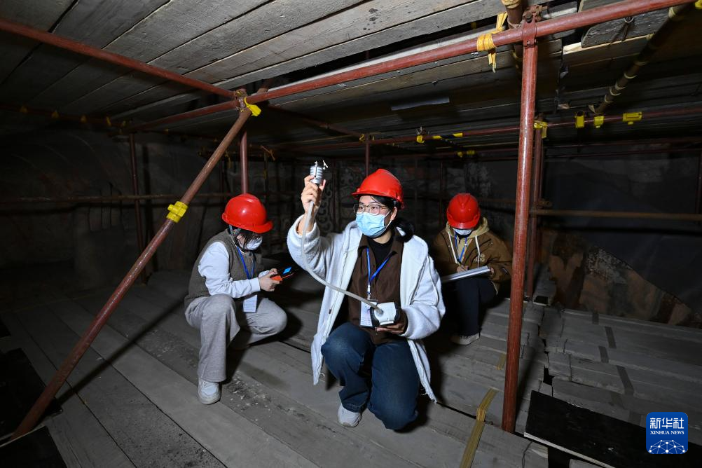 4月15日,来自中国石窟文化联合研究生院的山西大学博士生杨亚娟(中)团队在云冈石窟进行石窟气溶胶单颗粒采样。