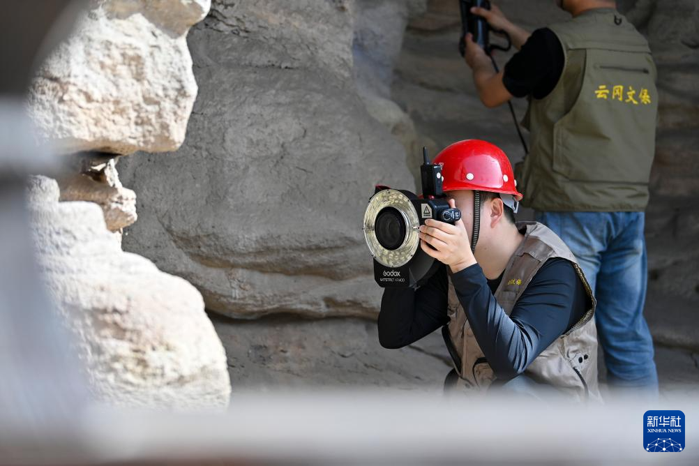 4月16日,云冈研究院数字化保护中心工作人员黄绎帆(左)在云冈石窟进行数字化信息采集。