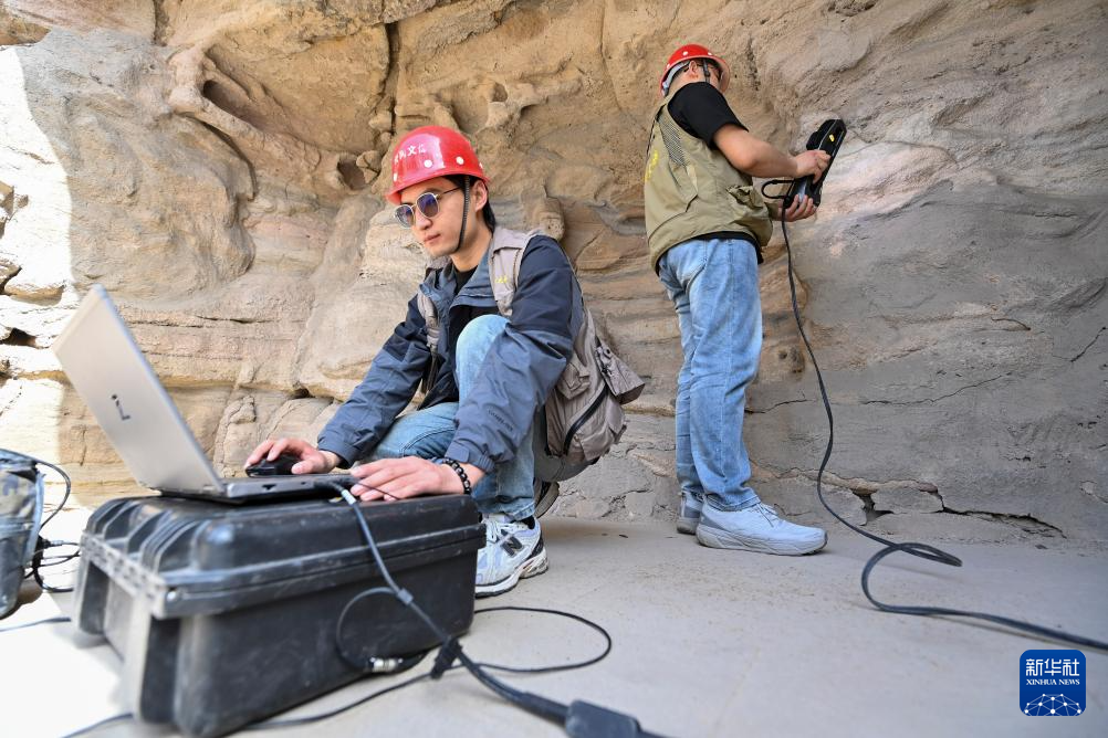 4月16日,云冈研究院数字化保护中心工作人员王超(左)在云冈石窟进行数字化信息采集。
