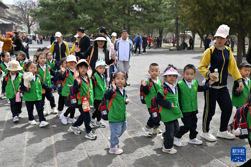 4月16日,在云冈石窟,小朋友在老师的带领下参观。