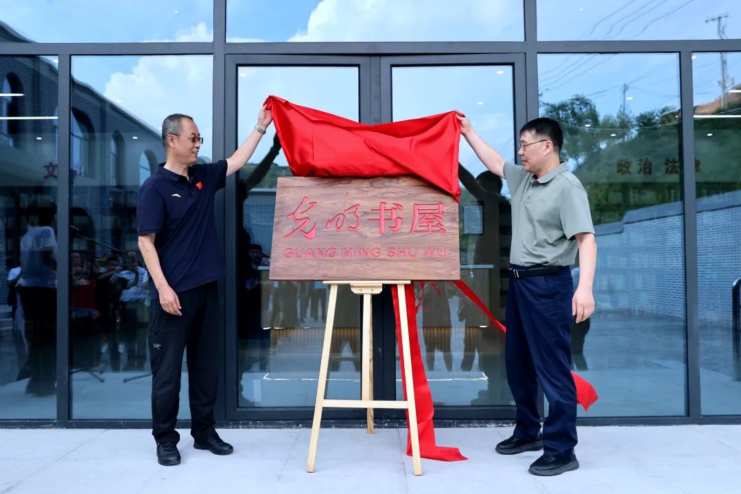 王婧主持揭牌仪式;苏争鸣介绍了光明书屋建设情况;陈品高、王晓斌共同为光明书屋揭牌。