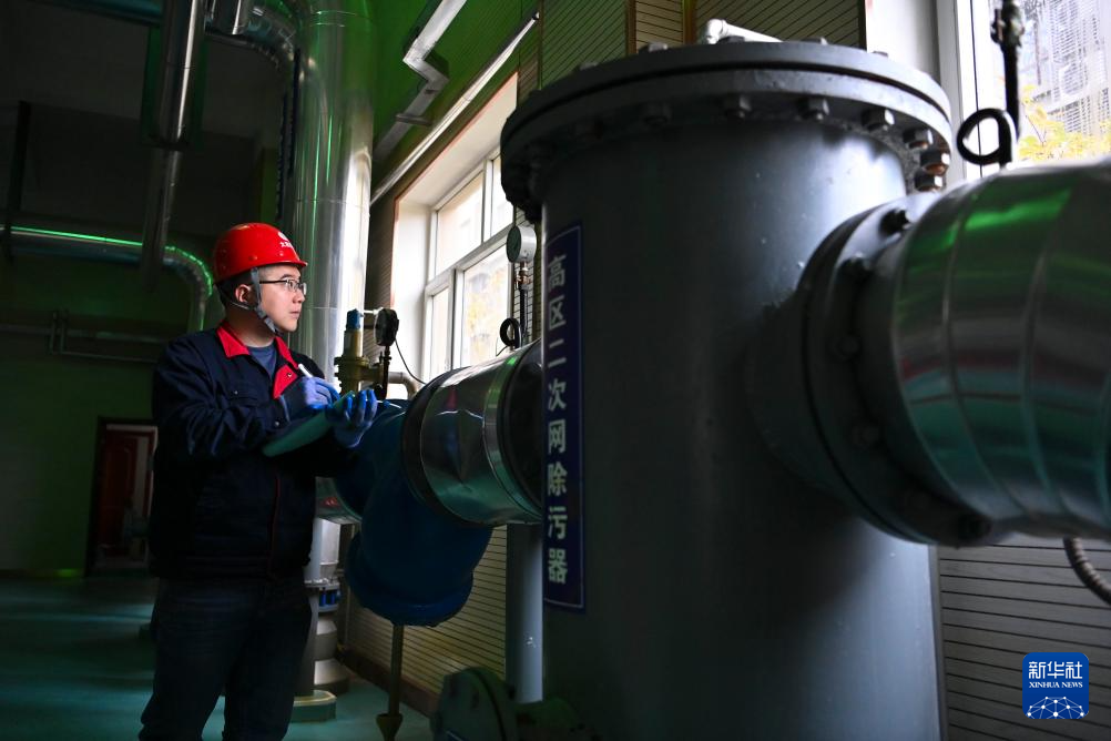 在太原市热力集团有限责任公司中继能源站,工作人员检查、记录设备运行情况(10月19日摄)。