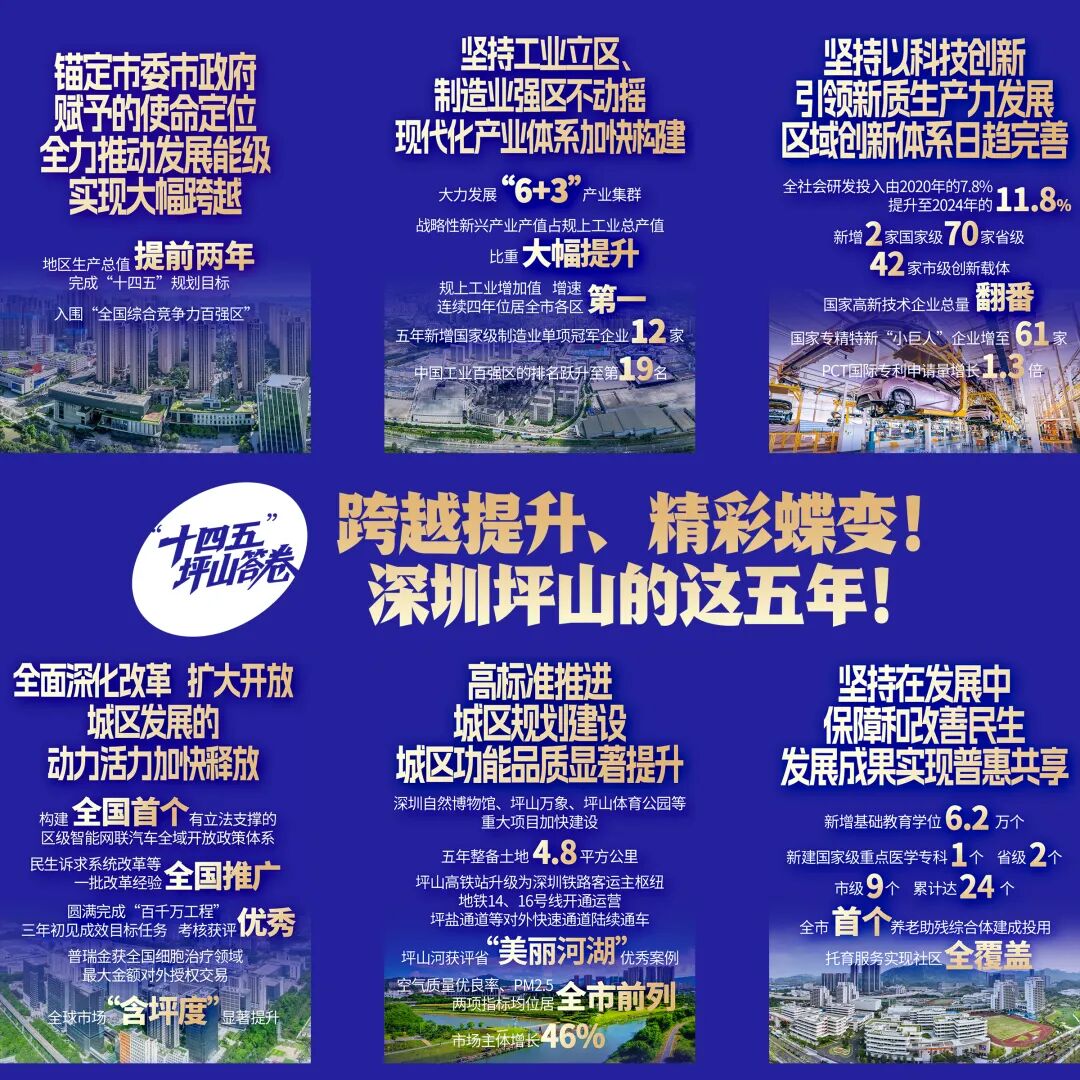 这五年,坪山对全市发展的贡献度日益提升,在全社会的显示度持续扩大,坪山产业体系持续向新提质、向优升级,实体经济根基更加巩固。