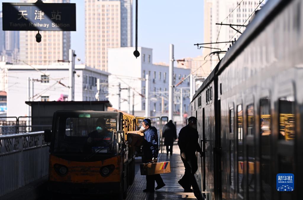 2月8日,在天津站3站台,工作人员从列车上卸货。