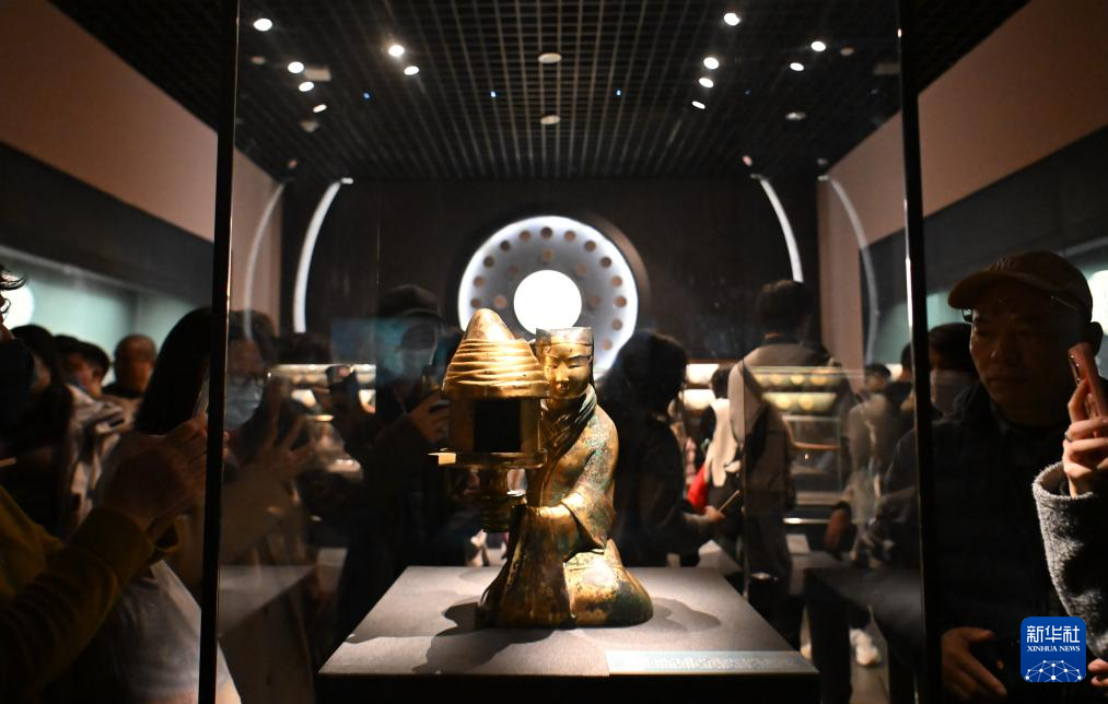 2025年1月1日,在天津博物馆,观众参观展览展出的长信宫灯。