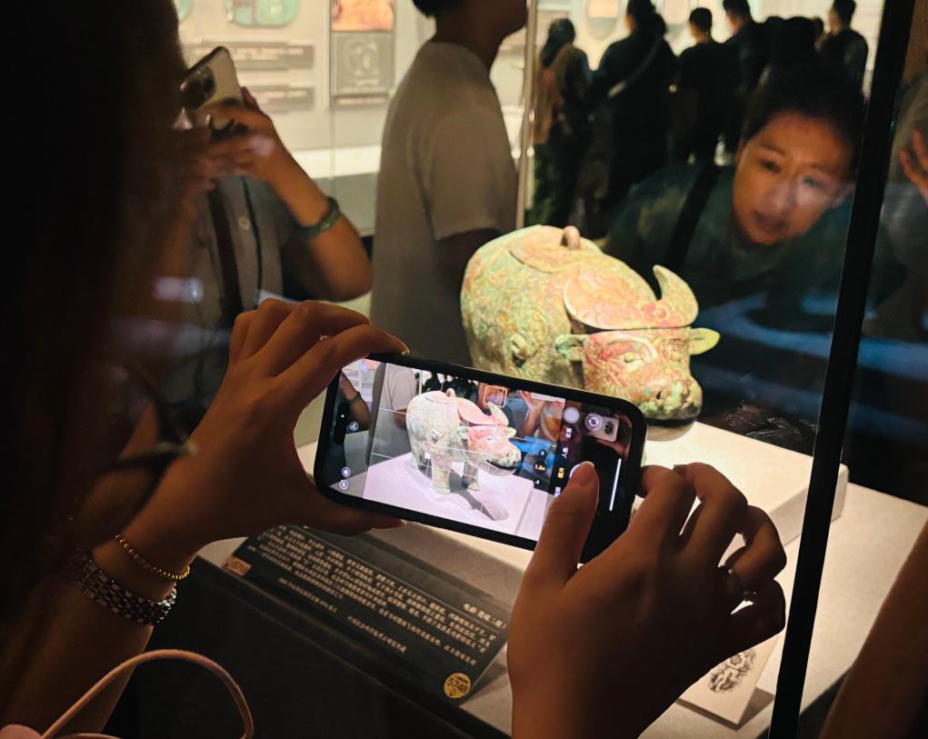 观众在展览上赏拍展出的亚长牛尊。新华社记者 周润健 摄