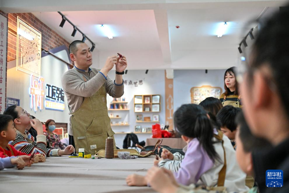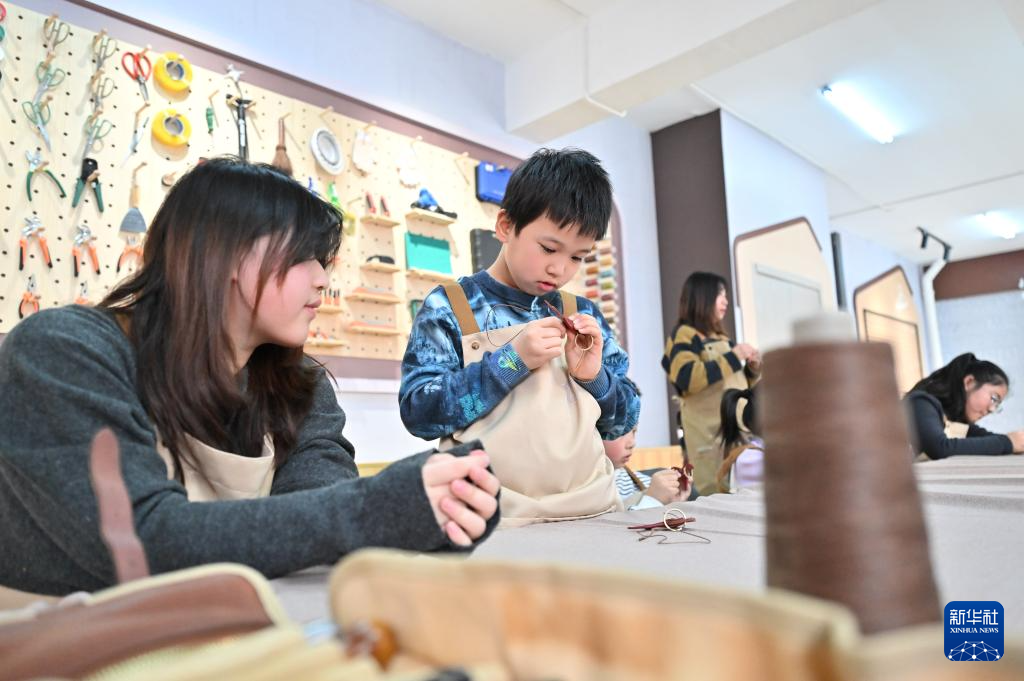 1月30日,在天津市河北区王串场街道环盛里社区,小朋友在工匠指导下缝补皮具。