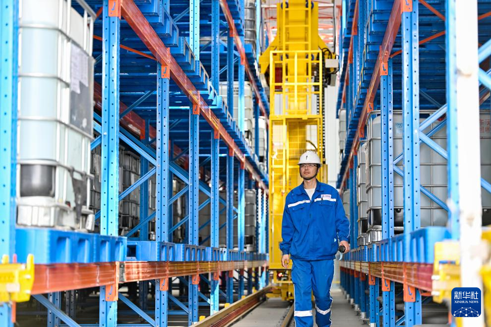 4月15日,在中海油(天津)油田化工有限公司南港化工厂,工作人员在智能库房查看。