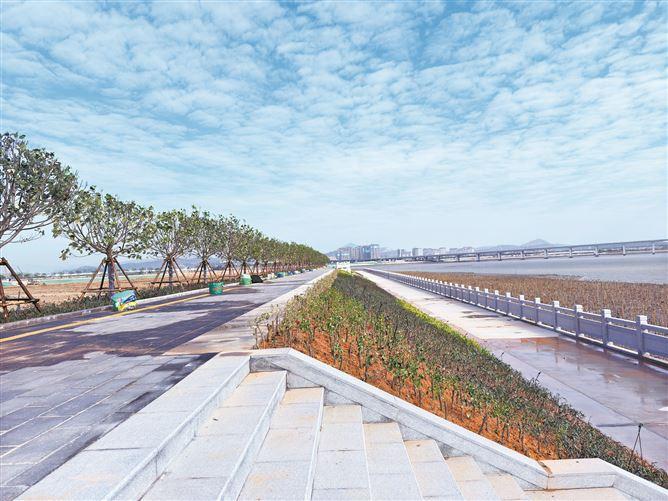 据介绍,该项目紧邻大嶝大桥,是厦门翔安国际机场片区的配套建设工程,施工内容包括新建总长1058米的护岸。同时,项目自海侧向岸侧依次布置了一级亲水平台、人行踏步和生态护坡、人行廊道与弧形观景平台、人行道绿化带等设施。