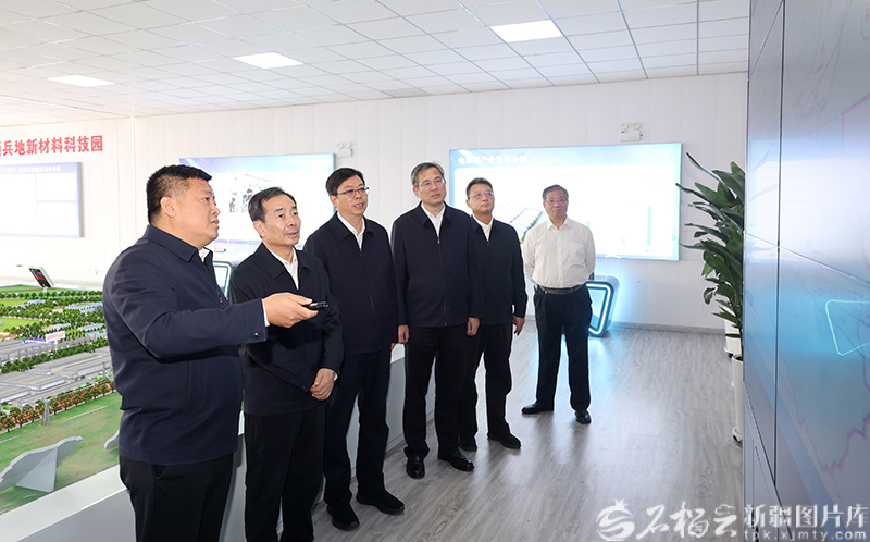 9月9日,自治区党委书记、兵团党委第一书记、第一政委陈小江在新疆塔额兵地新材料科技园,听取园区新能源项目规划和重点项目推进情况介绍。石榴云/新疆日报记者崔志坚摄
