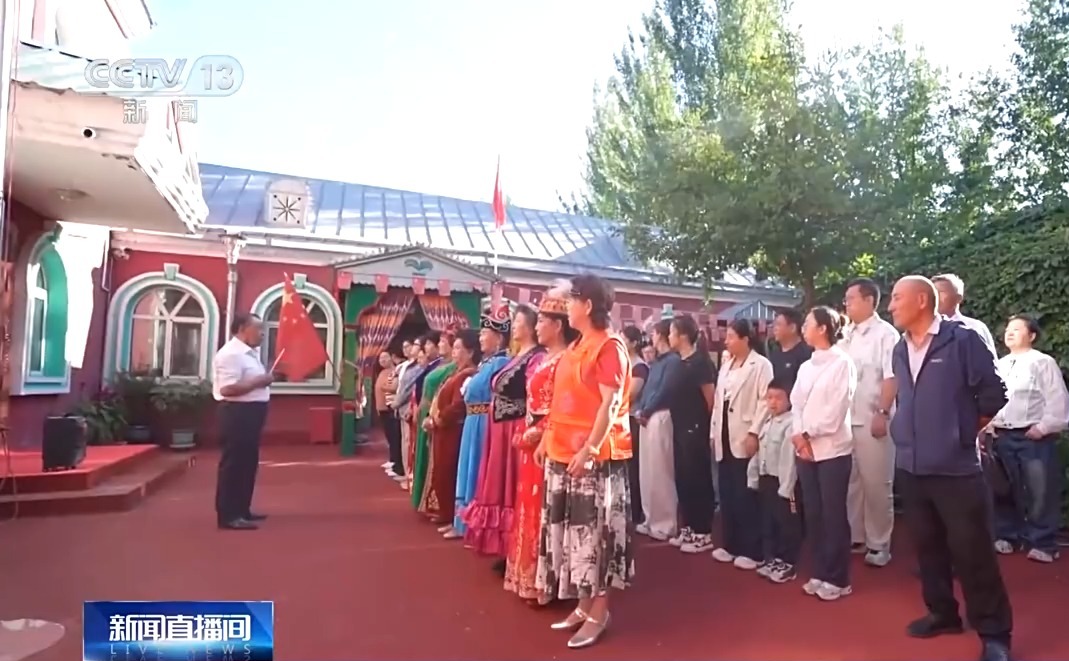 新疆塔城市新城街道哈尔墩社区居民沙勒克江·依明:原来没升过国旗,怎么升?国歌音乐两个配合起来,一定要把它熟练。第一次早晨升国旗的时候,突然我两个腿就软了。五星红旗,给我力量,一边升我一边哭。从那开始,我就说我有两个妈妈,一个妈妈就是我的亲生妈妈给了生命。第二个妈妈就是我的祖国妈妈。