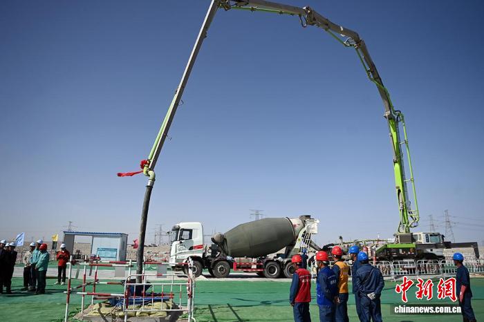 9月27日,若羌—羚羊750千伏输电线路工程(新疆段)进行首基铁塔基础浇筑。马元 摄