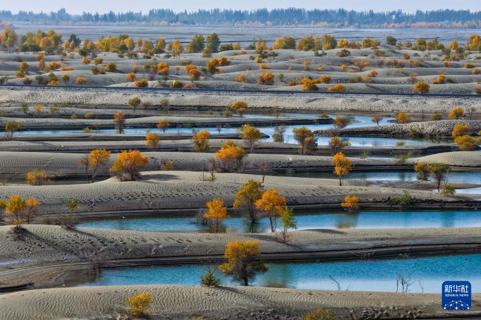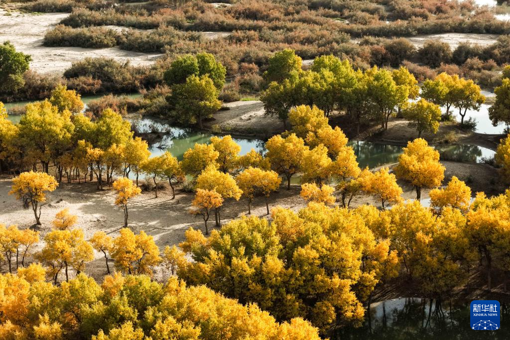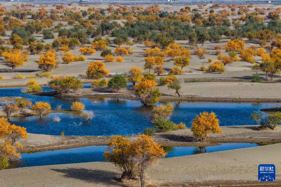 在新疆和田地区和田县翡翠湖,成片胡杨林坐落其中(无人机照片,10月20日摄)。