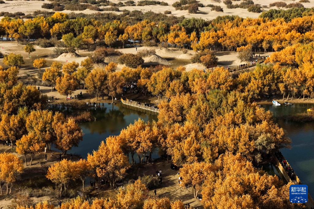 时下,新疆和田地区的胡杨迎来最佳观赏期,成片换妆的胡杨林与水天相映,共绘金秋美景。
