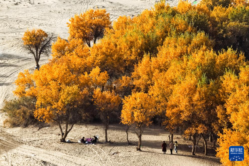 游客在新疆和田地区洛浦县洛滨胡杨林景区游览(无人机照片,10月19日摄)。