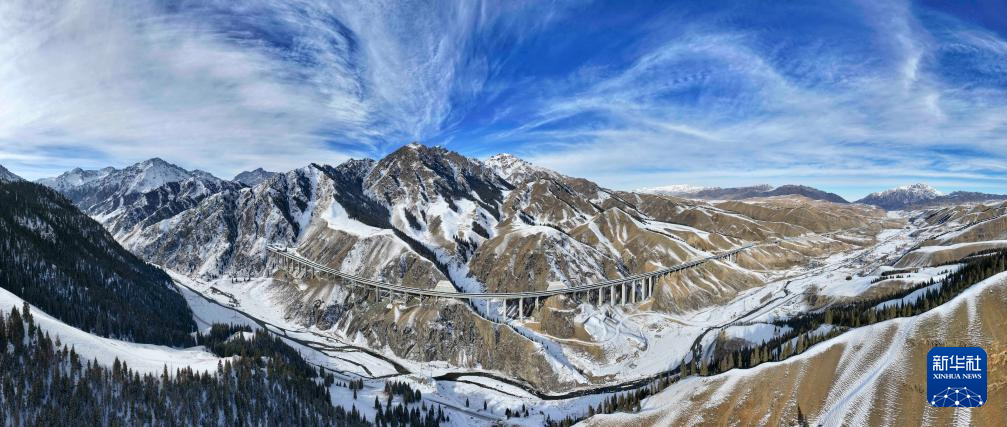 桥隧相连的乌尉高速公路穿越天山山脉(12月23日摄,无人机全景照片)。
