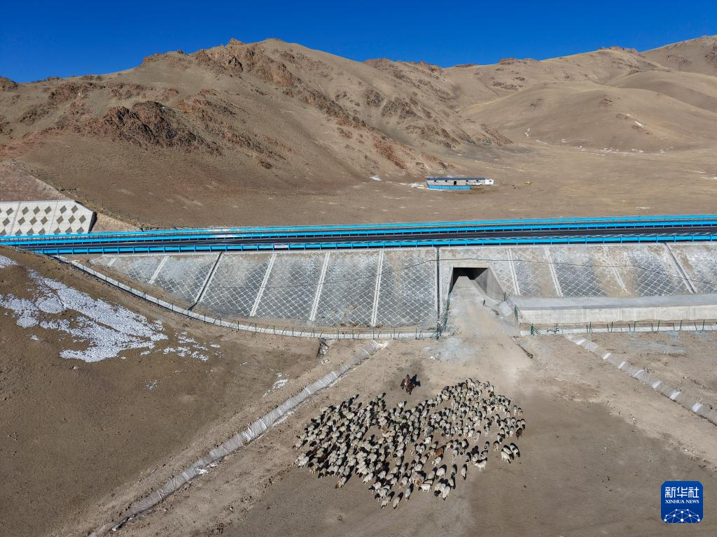在新疆和静县,牧民赶着羊群从乌尉高速公路路基下穿过(12月23日摄,无人机照片)。