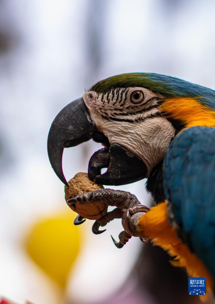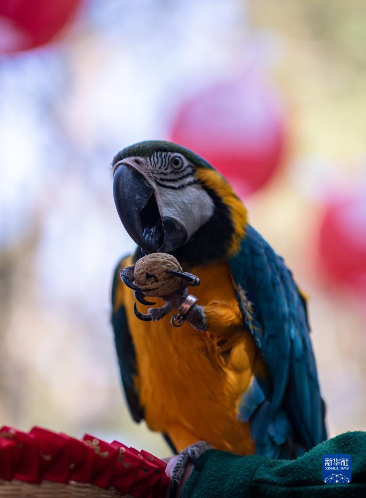 2月4日,云南野生动物园的金刚鹦鹉品尝坚果。