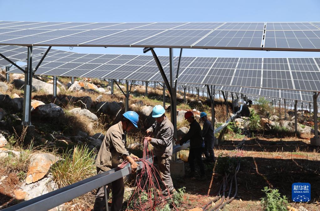 4月6日,工人在砚山县平远小石岩光伏电站安装电线。