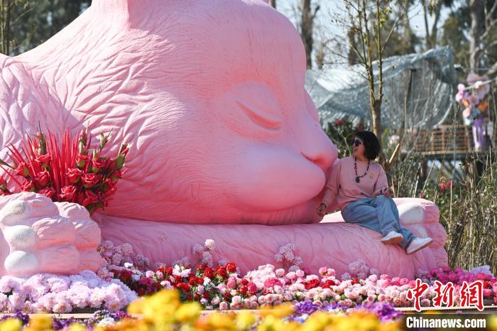 2月20日,游客在花海中与粉色猫咪“互动”。近日,位于云南省昆明市的海洪莫奈花园正式向公众开放。花园以“四季花海”为景观特色,以“幸福包容”为主题氛围,吸引不少市民、游客前来观赏打卡。中新社记者李嘉娴 摄