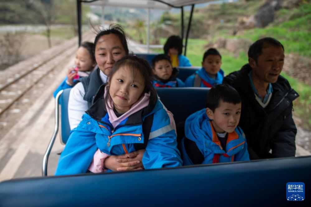 2月23日,云南省宣威市普立乡尼珠河村的小学生们在家长的带领下乘坐景区观光车。