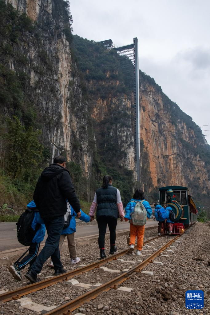2月23日,云南省宣威市普立乡尼珠河村的小学生们走出观光电梯准备转乘缆车。