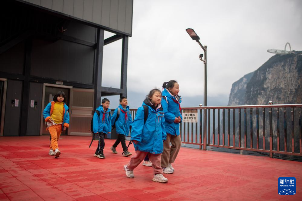 如今,当地的孩子先乘坐六七分钟景区观光车,转乘观光电梯垂直爬升268米,再换乘空中缆车爬升200余米,加上步行,半小时就能到学校。