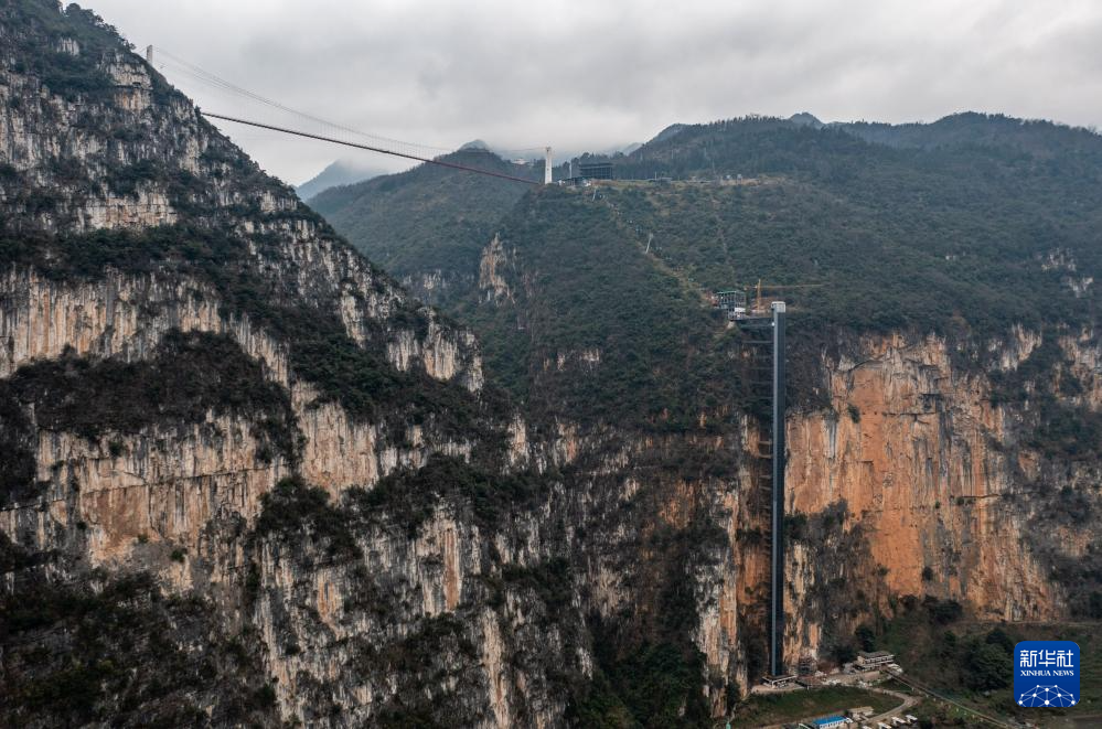 2月23日,云南省宣威市普立乡尼珠河大峡谷的观光电梯和缆车(无人机照片)。