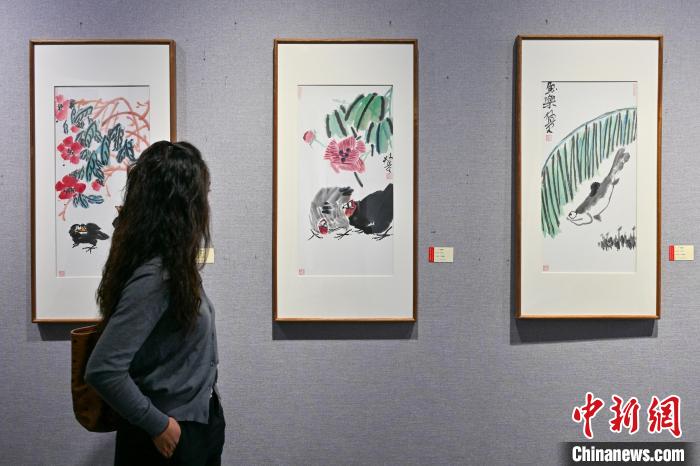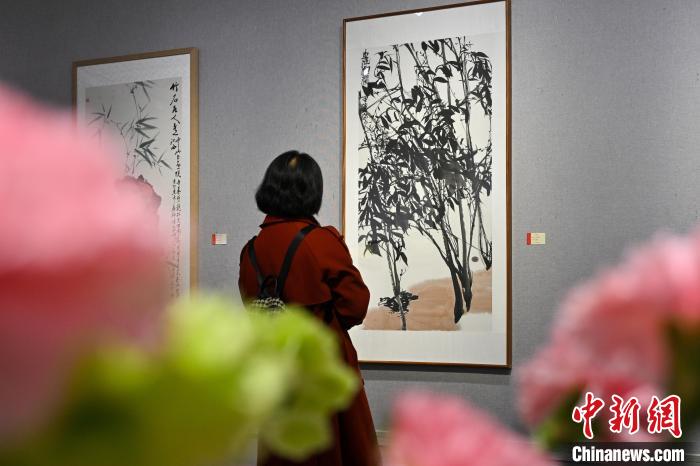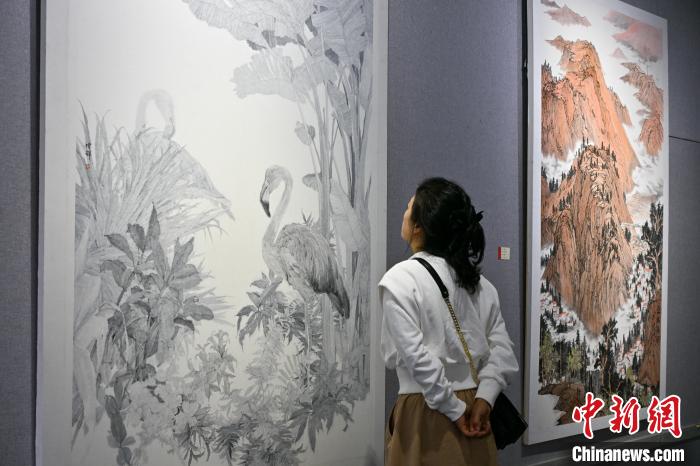 3月10日,云南昆明,展出的中国画作品《花鸟》吸引观众。中新社记者 李嘉娴 摄