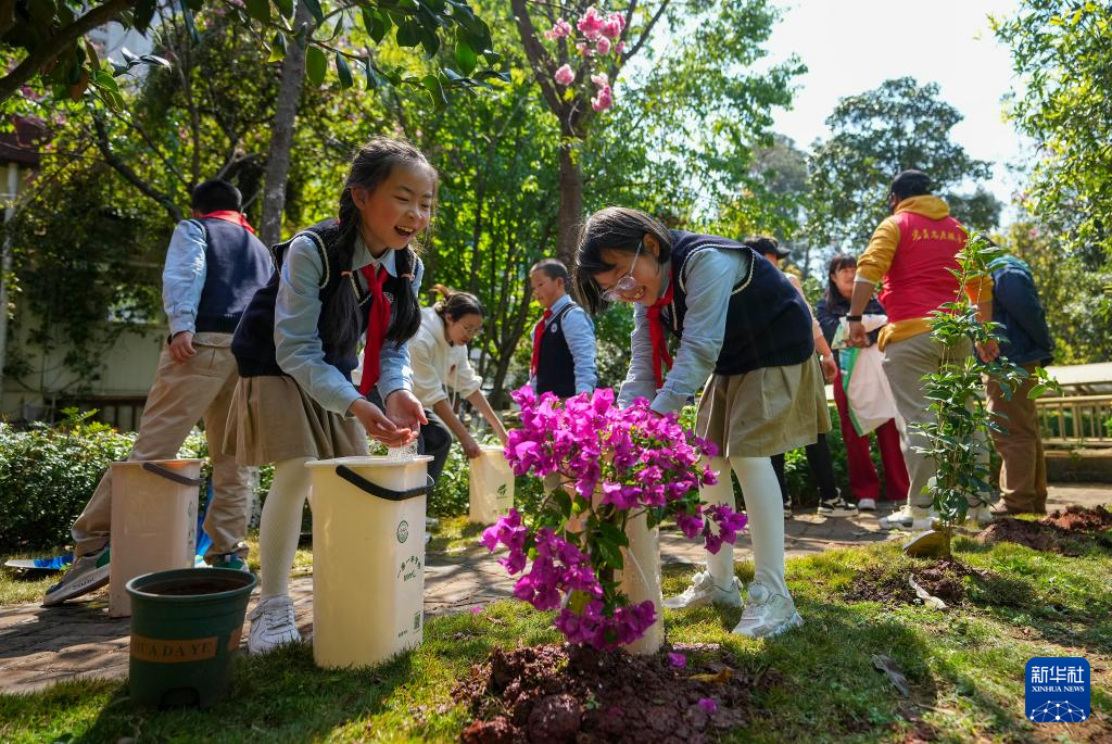 3月11日,在云南省昆明市盘龙区长青社区,几名小学生为刚种的三角梅浇水。