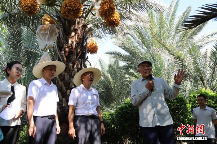 中新网昆明8月6日电 (罗婕)8月,被称为“中阿友谊果”的椰枣在云南省玉溪市元江哈尼族彝族傣族自治县迎来成熟期。试验种植基地里,一串串椰枣硕果累累,挂满枝头。近日,来自云南、四川、海南等地的椰枣种植领域专家学者及企业代表等共聚于此,参与椰枣引种试种观摩会,见证中国和阿联酋椰枣合作成果落地。