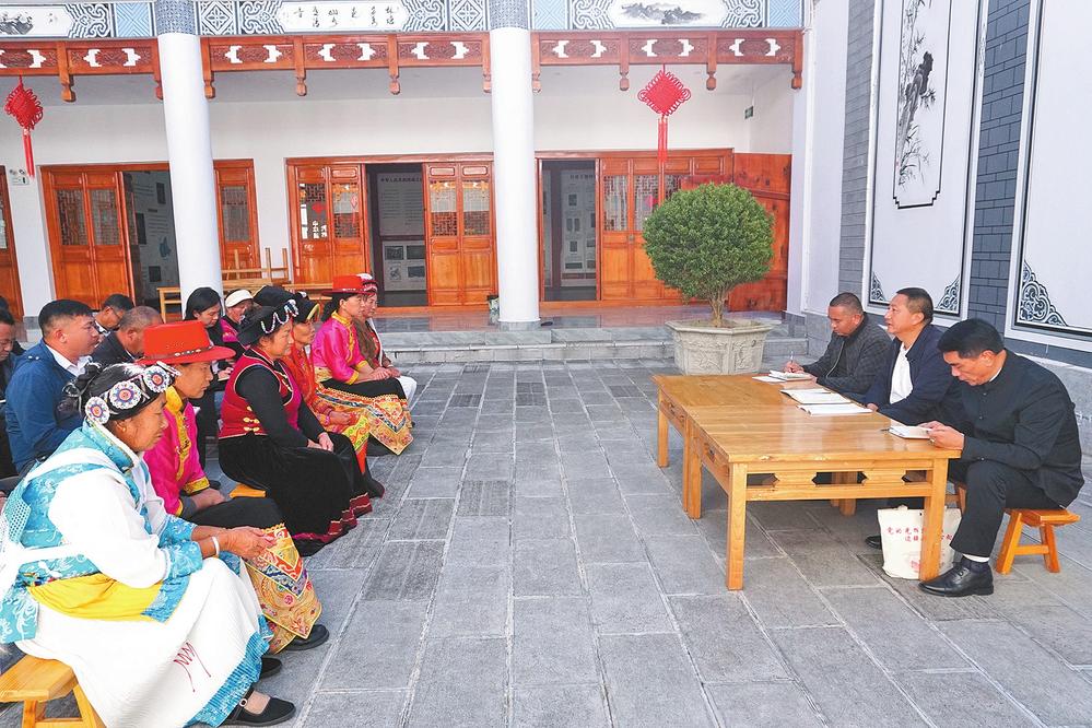 在省人大常委会人大民族工作基层联系点——三营镇人大代表工作站,洱源县人大常委会主任何家伟(右二)向群众宣讲党的二十届四中全会精神。