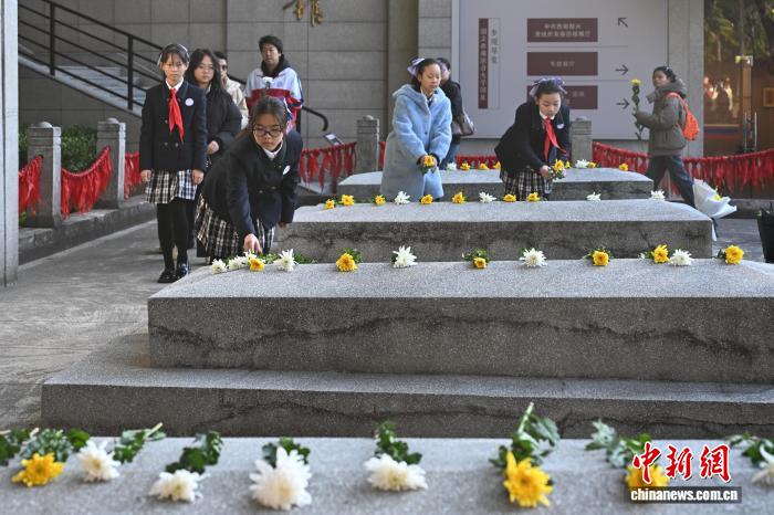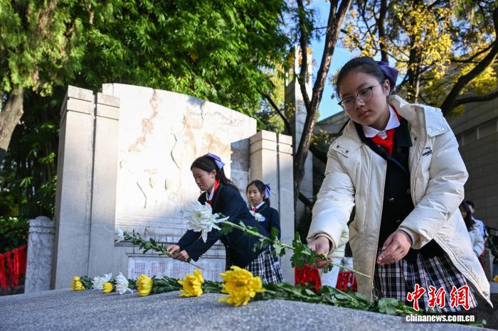 12月1日,小学生在烈士墓敬献鲜花。中新社记者 李嘉娴摄