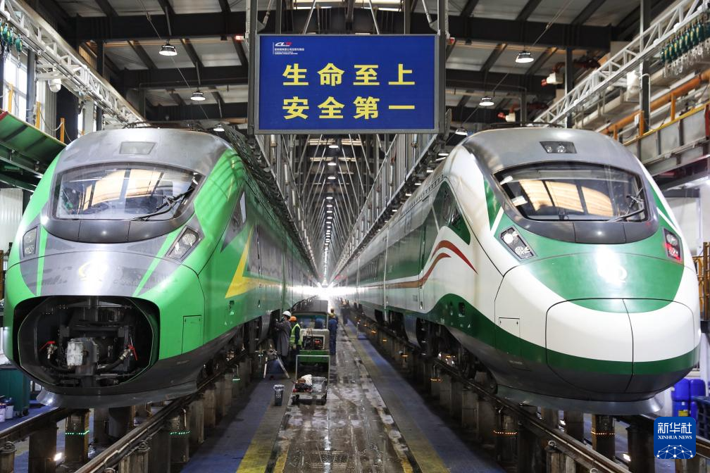 1月28日凌晨,工作人员在南京南动车运用所检修动车组列车。