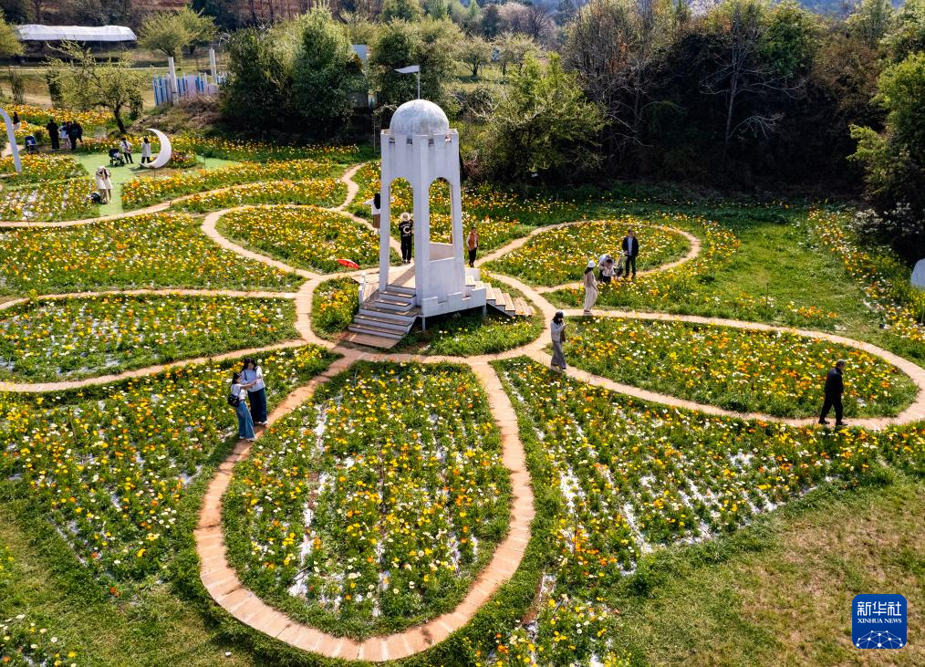 3月10日,游客在昆明名花谷游玩(无人机照片)。