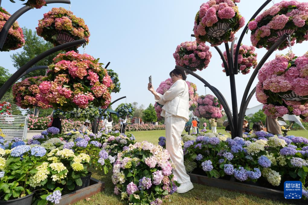 4月28日,人们在花园大会绣球展区参观。