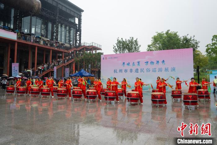 5月5日,现场奏响激昂的二十四节令鼓。当日,第十四届“中国二十四节气·人类非遗半山立夏”民俗活动在杭州市拱墅区举行,非遗巡游嘉年华、非遗花伞市集等活动吸引众多游人。中新社记者吴君毅 摄