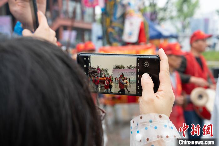 5月5日,一位游人记录现场画面。当日,第十四届“中国二十四节气·人类非遗半山立夏”民俗活动在杭州市拱墅区举行,非遗巡游嘉年华、非遗花伞市集等活动吸引众多游人。中新社记者吴君毅 摄