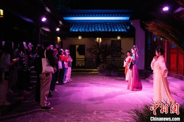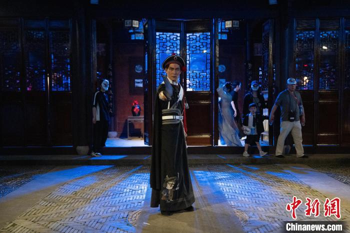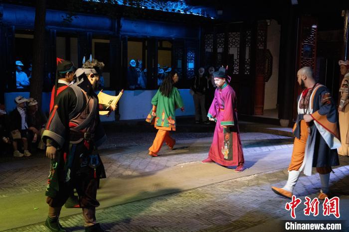 5月7日,头戴水浒人物面具的观众沉浸式观看演出。中新社记者吴君毅 摄
