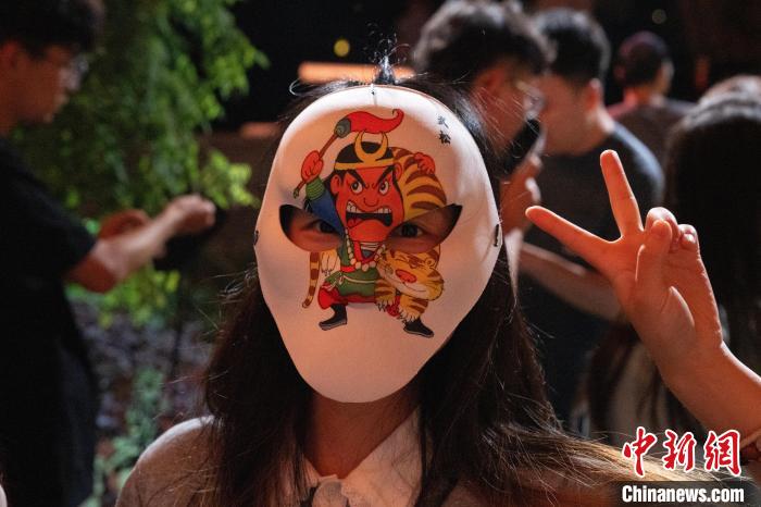 5月7日,头戴武松面具的观众。中新社记者 吴君毅 摄