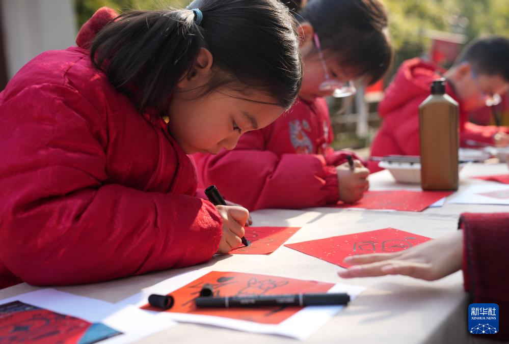 1月23日,书法爱好者在活动现场为社区居民写福字和春联。