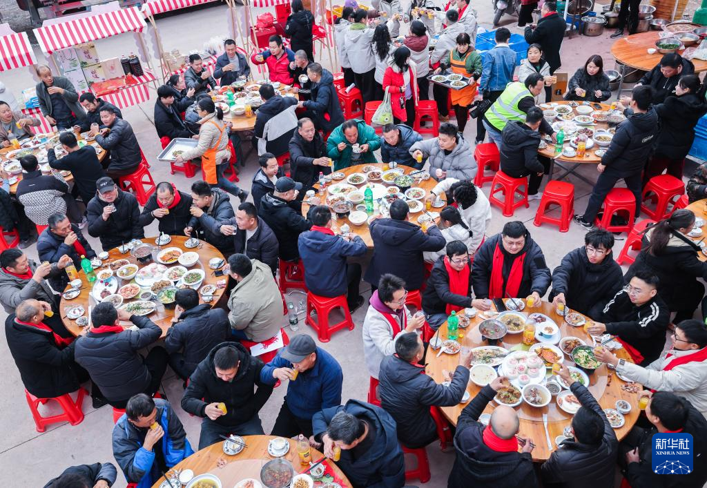 2月9日,在建德市更楼街道司机之家,货车司机和其他外来务工人员一起参加“奔走千里路·幸福一家亲”团圆年夜饭活动(无人机照片)。